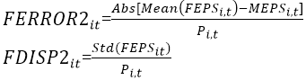 Std(FEPSi,t)为公司i第t年的所有证券分析师最近一次每股盈余预测的标准差