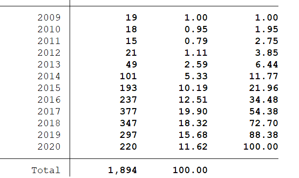 2009-2020上市公司环保处罚数据原始的数据量为3790个样本(某些企业同一年被处罚几次,因而同一个企业会被统计多次)