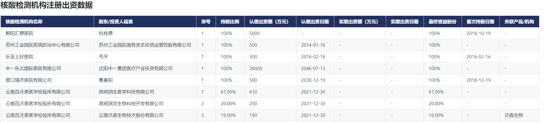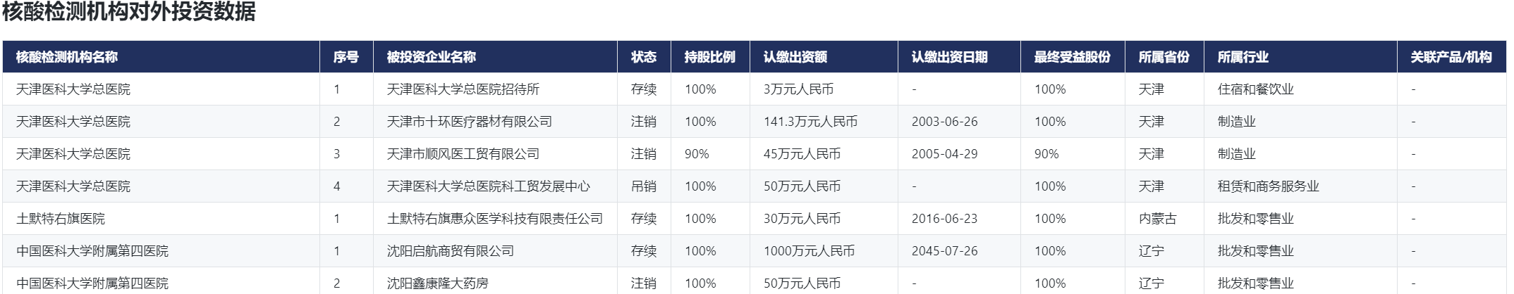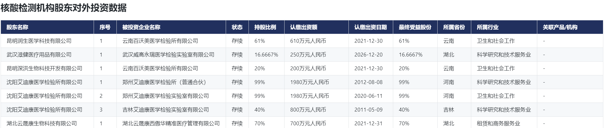 核酸检测机构工商注册数据依据全国核酸检测机构名单,获取了所有核酸检测机构的工商基础信息、股东信息、股东对外投资信息、工商变更信息等,为相关研究助力。1.时间区间: