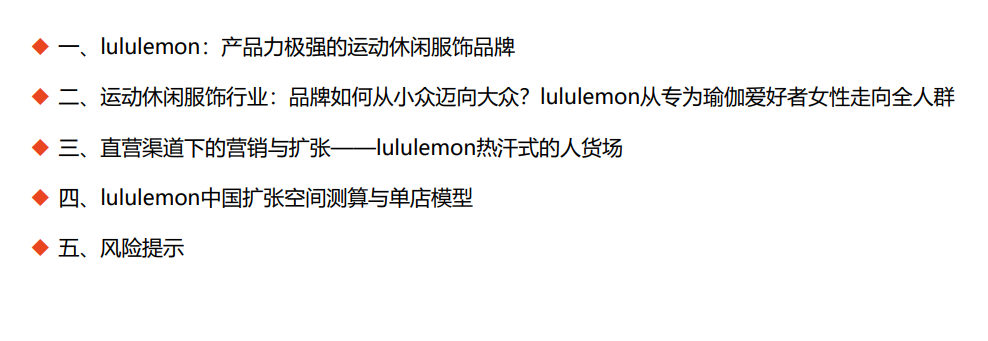➢ 行业翘楚lululemon的成功之道是坚持直营门店(Vertical Model)进行社群营销和精细运营,人、货、场得以扩张,打开品牌成长天花板:公司从创立之初就坚持线下直营门店,我们认为这是品牌在品类、人群、场景的扩张顺利之重要原因所在。直营在人员、创新、营销等各个方面对比传统批发模式均有革新——高端定位的门店、高素质店员交互体验,社区运动KOL的社群营销顺利进行,由此建立社区成员“热汗式”的联结,扩大品牌的影响力。消费场景和使用场景的重叠增强了产品的感官冲击力。在产品壁垒、优质渠道与品牌形象共同影响下,产品的扩品类获得成功。同时因为对运动垂直领域人群的影响,从健身房到庭,