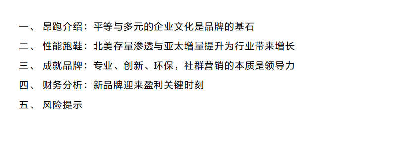 • 昂跑专业创新与精神内核兼备,多渠道和DTC发力赋能具有领导力的品牌:作为新一代跑鞋,昂跑所具备专业、创新、环保的特质吸引了其信众加入“部落”,其七大科技提供“轻盈触地,强力回弹的”运动体验。品牌又因其多元化的产品组合与精细化服务方式,以及组织丰富、高频的社群活动加深“部落”联系,增加用户粘性,本质上体现了品牌的领导力与号召力。多渠道战略下昂跑品牌终端零售业态分为直营、专营与综合店,计划持续发力DTC以维持高毛利水平,产品极少打