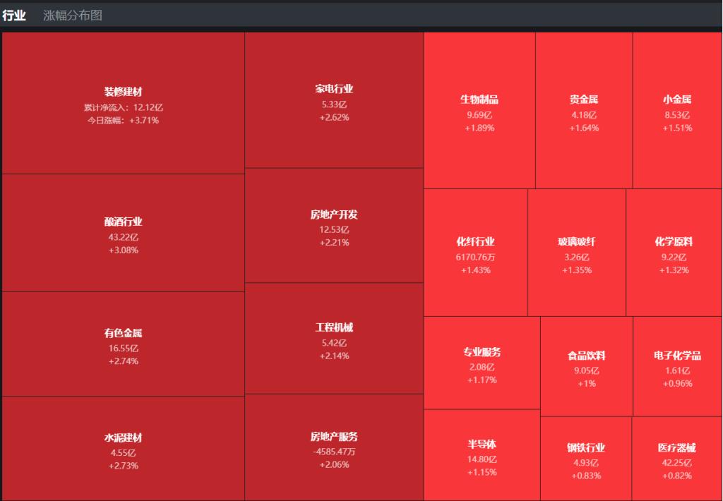 【热点板块】今日板块通过热力图来看,涨幅靠前的是装修建材、酿酒行业、水泥建材、有色金属、家电行业、房地产开发、生物制品、工程机械等。四维分析来看,今天有7个板块涨幅超过2%,主要是因为地产这条主线开始发力,带动地产服务、装修建材、水泥建材、地产开发、工程机械等这一趟线都是出现了普涨格局。现在市场不缺乏盘中的热点,今天盘中包括钢铁和有色也都有所表现,现在缺乏的是持续反弹的热点,以板块领涨的装修建材为例,能够触摸到涨停的只有江山欧派这一只,并且还是在下午两点左右冲了一下涨停,而同板块其他个股没有敢冲涨停的,水泥建材也是一样,龙头海螺水泥今天拉出一颗中阳线,但是其他基本都是跟风状态、没有主动冲击涨停的,反弹的力度都是比较弱。