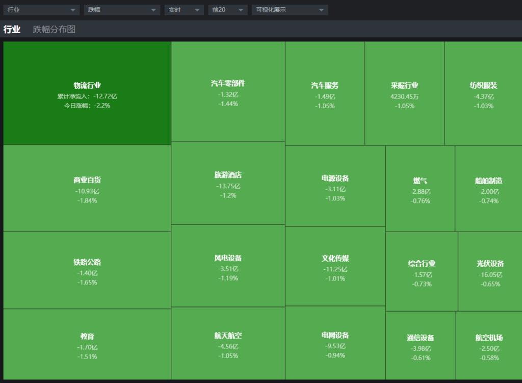 再来看一下跌幅榜,通过热力图来看跌幅靠前的物流行业、 商业百货、汽车零部件、电网设备、铁路公路、教育、航天航空等。物流行业、商业百货、铁路公路等这都是近期表现还不错的板块,处于补涨的阶段,反弹持续2-3个交易日也开始出现了调整,包括近期出现异动的旅游板块也是集体调整,并且部分个股调整的幅度开始加大,昨日封涨停板的桂林旅游今天直接中阴线调整,这样的现象会导致短线资金不敢积极去参与反弹了,市场赚钱效应会逐步下降。
