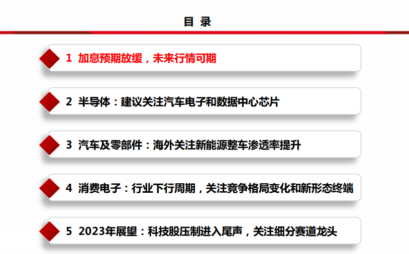 海外科技股经过一年深度调整后,不少头部企业已进入性价比区间,随着通胀预期减弱,加息力度或有所放缓,对科技股估值的压制或进入尾声。科技股2023年有望否极泰来,建议关注结合业绩和估值具有性价比的龙头企业。