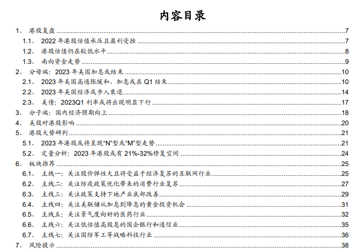 周期在面前,但更需思考核心逻辑的草蛇灰线。从经济周期的角度,相差几个月的周期运行状态可能对周期趋势的整体并无影响(因为短周期的基钦周期平均持续时间也超过 3 年),但是可能对股市投资造成指导误差,因为一年只有 12 个月,而且未经滤波的运行状态可能夹杂着噪音。所以尽管 2023 年海外经济可能是滞涨状态,而国内经济大概率因为政策催化和较低基数出现可观增长,但本报告并不侧重于根据周期的分野来展望未来,而是试图根据基本面和政策面的推演并结合港股的特点来分析港股在 2023 年可能的走势。