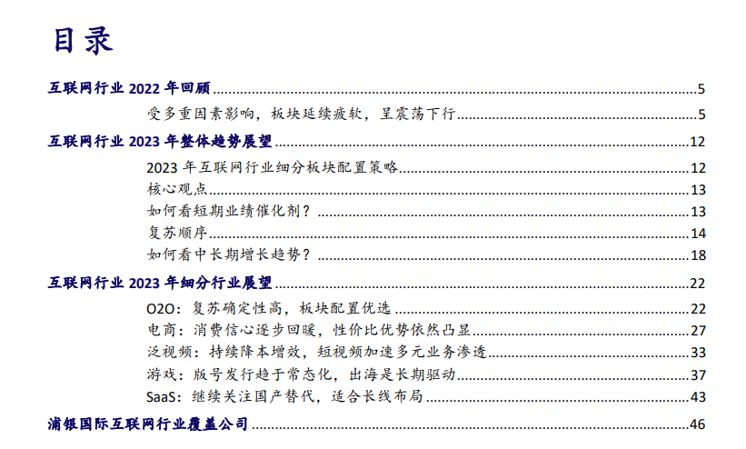互联网行业2023年细分行业展望:我们看好的细分板块依次为:1)O2O:直接受益于防疫政策调整,业绩复苏确定性高,板块配置优选;2)电商:消费信心逐步回暖,性价比优势依然凸显,直播电商抢占市场份额;3)在线视频:持续降本增效,短视频加速多元业务布局,关注视频号商业化进度;4)游戏:版号发放趋于常态化,出海是长期驱动;5)SaaS:继续关注国产替代概念,适合长线布局。