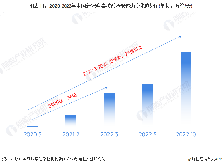 根据国务院联防联控机制新闻发布会上发言人公布的数据显示,2020年3月,中国新冠病毒核酸检验能力仅为126万管/天,经历2年,2022年3月,中国新冠病毒核酸检验能力增长了36倍,达到每天检测4500万管的水平。截至2022年10月,中国新冠病毒核酸检验能力大幅增长,其十混一的日检测能力已达亿管。