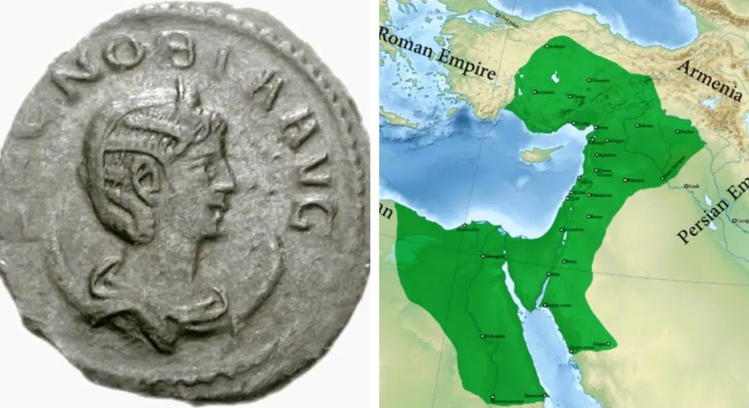 ▲ 货币上的芝诺比亚头像和公元 271 年达到顶峰的帕尔米拉王国版图