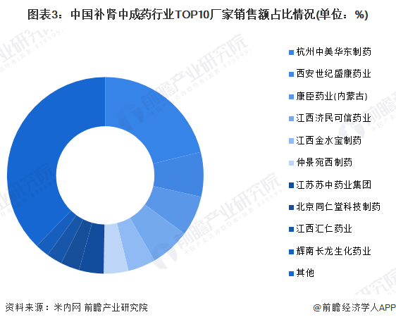 从补肾中成药制造企业销售额来看,杭州中美华东制药、西安世纪盛康药业、康臣药业(内蒙古)、江西济民可信药业、江西金水宝制药、仲景宛西制药、江苏苏中药业集团、北京同仁堂科技制药、江西汇仁药业、辉南长龙生化药业十大企业位居国内补肾中成药品行业销售额排名前十,其中杭州中美华东制药的销售额位居领先地位,占比超过20%。