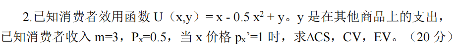 已知消费者收入 m=3,Px=0.5,当 x 价格 px’=1 时,求∆CS,CV,EV