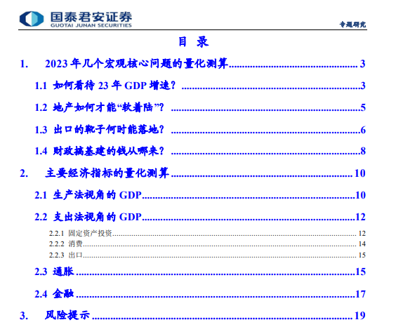 本篇报告,我们对国内主要宏观经济指标进行展望测算,并解答几个关键问题。地产如何才能“软着陆”?仅从房地产业对GDP的贡献来看,地产投资增速需要复苏至0附近。出口靴子怎么落地?对全年出口我们比市场更悲观,全年回落-7%以上。基建的钱从哪来?预计广义财政工具将发挥弥补资金缺口的作用,需要提供1.35万亿增量资金。整体来看,通胀全年处在较低水平,随着结构性政策发力,宽信用逐渐见效。