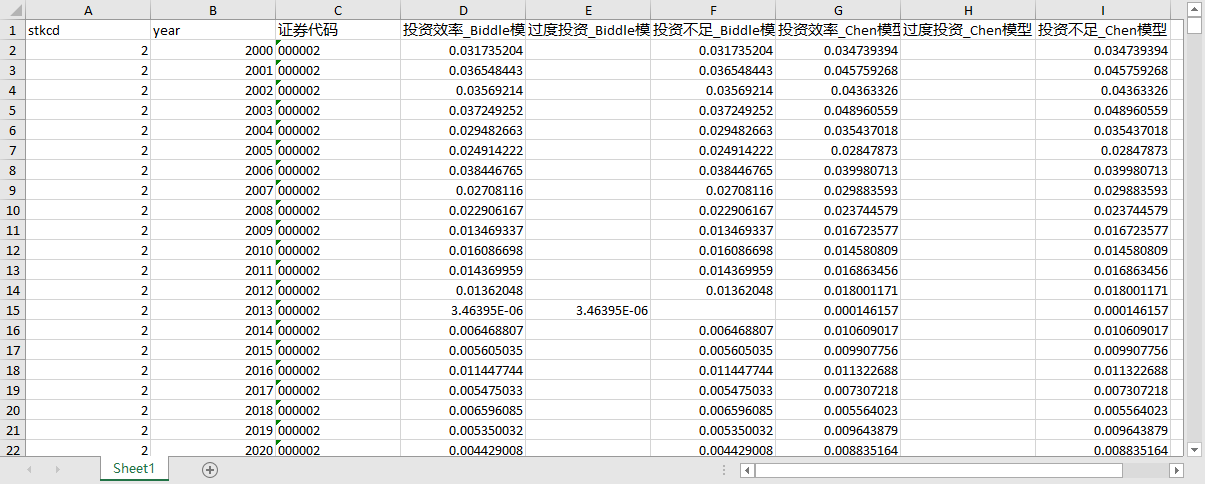 stkcd year 证券代码 投资效率_Biddle模型 过度投资_Biddle模型 投资不足_Biddle模型 投资效率_Chen模型 过度投资_Chen模型 投资不足_Chen模型