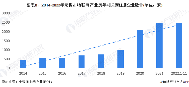根据企查猫查询数据显示,近年来物联网历年新注册企业数量也快速增长。截至2022年12月1日,无锡物联网产业相关的注册企业超11000家,其中2022年1-11月,无锡物联网产业注册企业数量超过2400家,处于历史高位,表明无锡物联网产业的发展热潮未减。