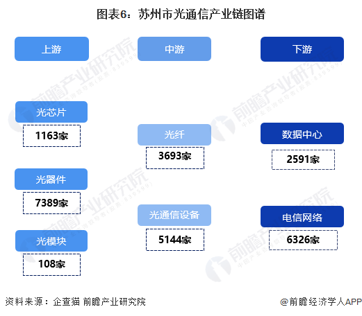 在政策指引和市场需求的驱动下,苏州市光通信产业链不断完善,其中,上游光器件,中游光通信设备和下游电信网络领域企业数量较多。
