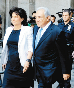 [提要] 7月1日,在美国纽约曼哈顿,国际货币基金组织前总裁斯特劳斯-卡恩(右)和妻子离开纽约州高等法院。美国《纽约时报》援引法国社会党前总理诺斯潘的话称,卡恩的获释对目前形势的影响如同晴天霹雳。