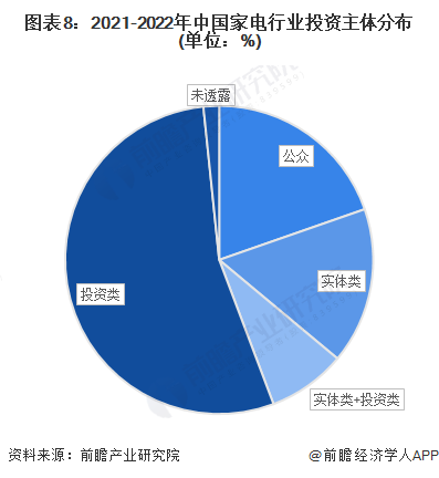 根据对家电行业投资主体的总结,目前我国家电行业的投资主体中投资类主体占比超50%,代表性投资主体有IDG资本、软银愿景基金等,而公众和实体类投资主体占比在20%左右。