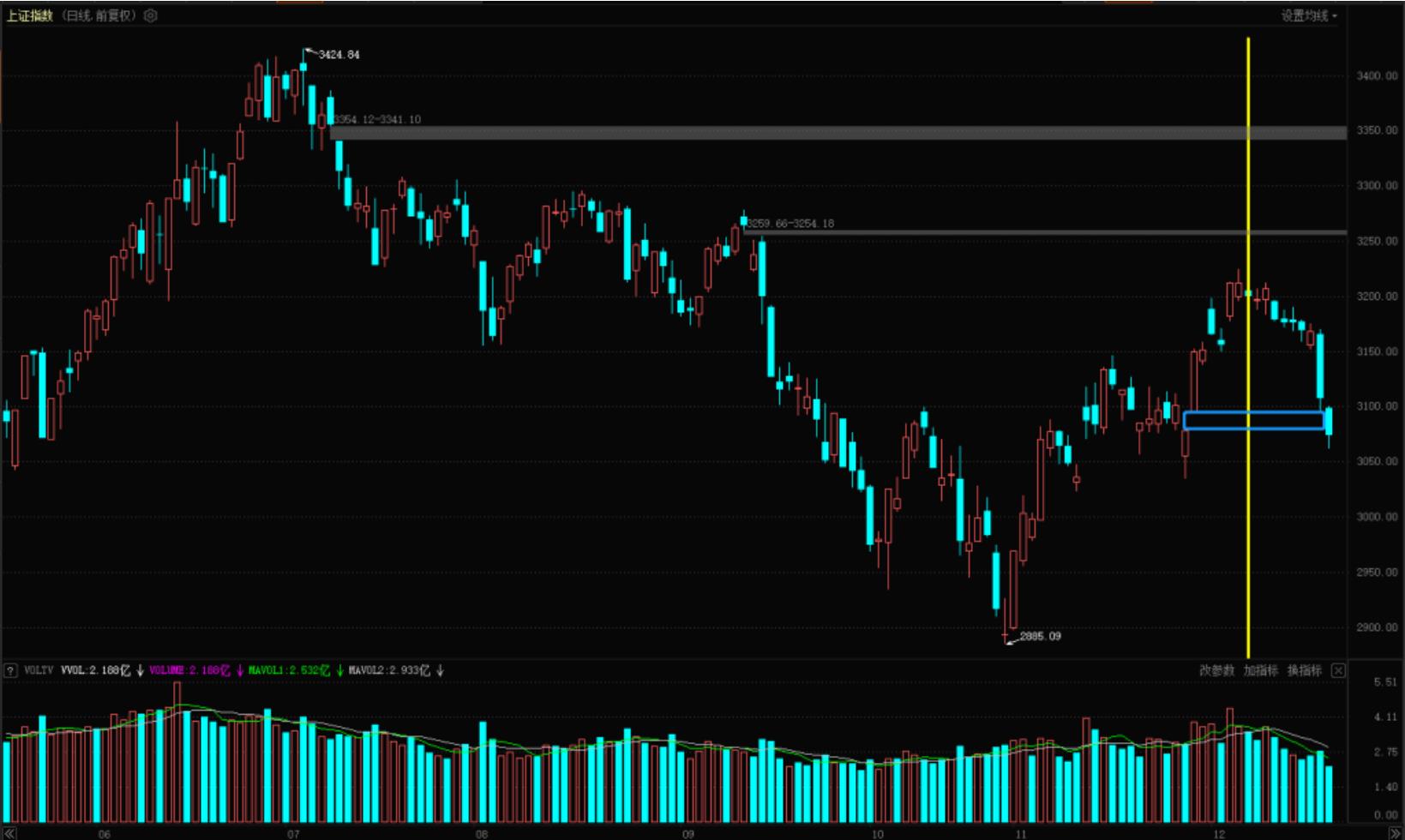 【日线分析】日线来看今天市场再次杀出一颗阴线走势,并且回补掉了11月29日以来的跳空缺口,缺口补了是好事,大盘向来是逢缺必补,缺口回补掉也就踏实了;从成交量上看今天市场收出了2885点反弹以来的最低成交量,说明市场资金只是在利用权重板块向下砸空间,而并没有实质性的大肆抛出筹码(当然也可能由于某些原因大家都躺在床上没法交易了)。