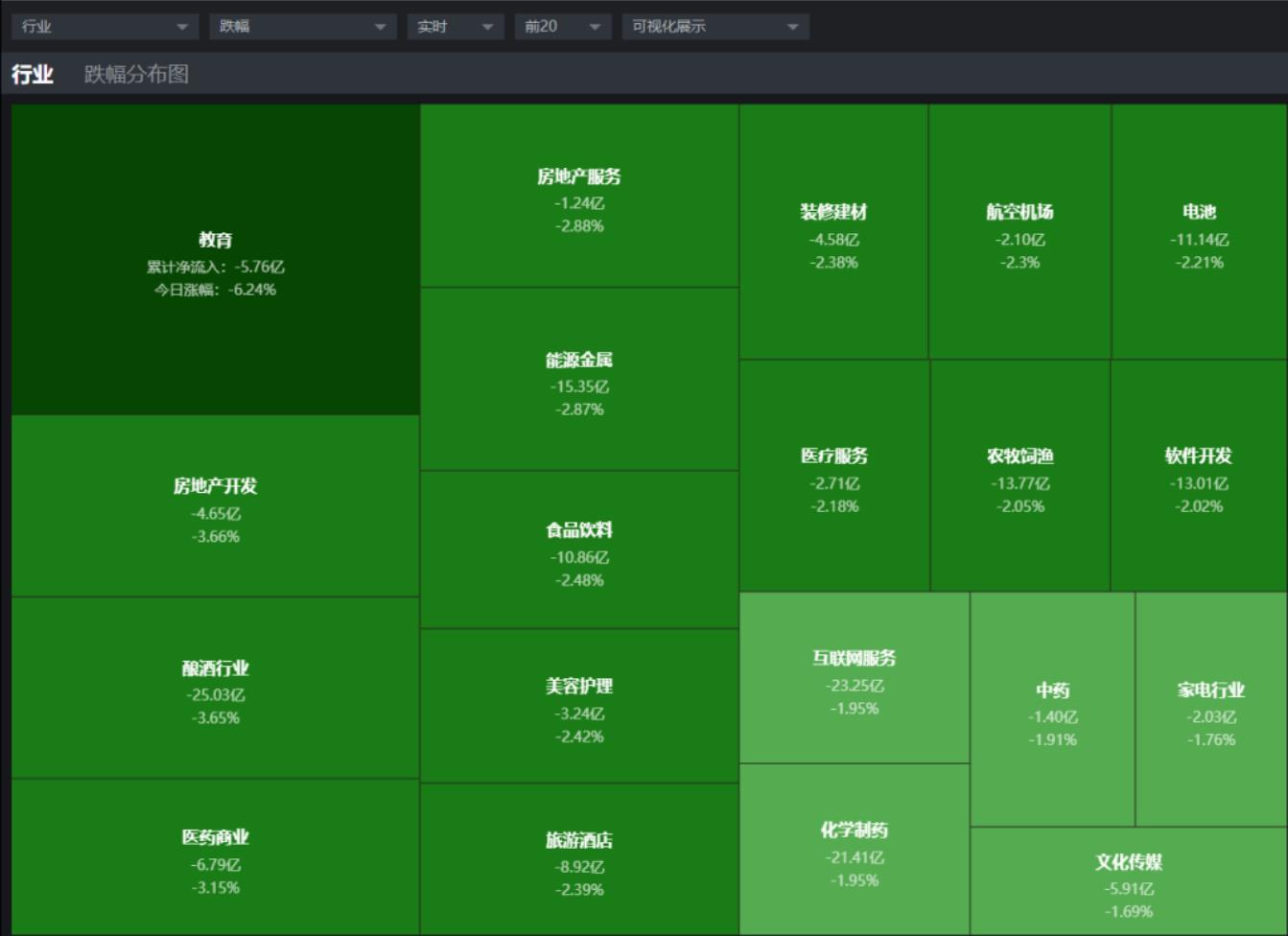 通过热力图跌幅榜来看,教育、房地产开发、酿酒行业、医药商业、房地产服务、能源金属、食品饮料等,从跌幅榜来看几乎都是短线的一些热点板块,反弹2-3个交易日就会出现一波急杀的走势,以教育板块为例,昨天还能够逆市收出阳线今天直接就是一颗反包的中阴线,前面逆市出现了四连阳被这一颗中阴线就击穿了,地产板块也是如此,前面一波又一波的利好消息不断释放,而每一波涨幅越来越弱这一颗中阴线杀出来前面涨幅几乎都被吃掉了,短线连续下跌之后是会有小部分板块出现反弹,但是抢反弹的难度很大,耐心等待止跌信号出现不着急上手。