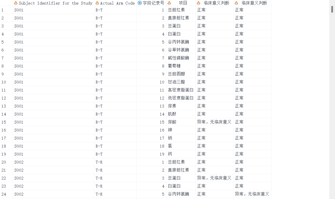 有原始数据集,如下,要制作第一张图那样的结果。有人能给给思路吗?最好有具体的编程例子。(俩张图不是完全匹配的,把表题目改成血生化,红细胞那列改为总胆红素那列)