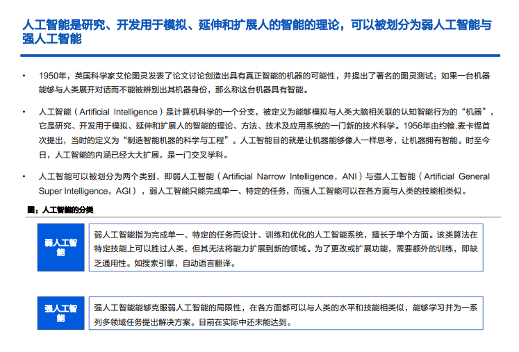人工智能可以被划分为两个类别,即弱人工智能(Artificial Narrow Intelligence,ANI)与强人工智能(Artificial GeneralSuper Intelligence,AGI),弱人工智能只能完成单一、特定的任务,而强人工智能可以在各方面与人类的技能相类似。