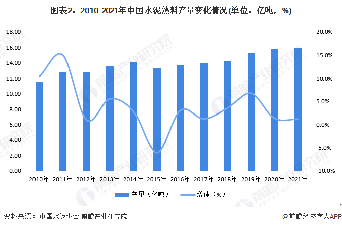 在水泥熟料产量方面,2010-2020年,全国水泥熟料产量呈波动增长趋势,2020年,全国水泥熟料产量为15.79亿吨,同比增长1.3%;2021年,根据新增产能的释放情况测算,水泥熟料产量达到15.98亿吨,同比增长1.2%。