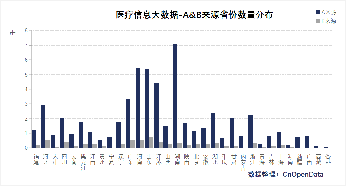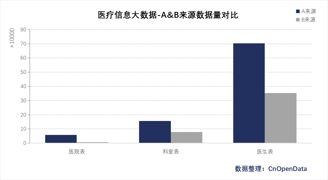 · 在覆盖主体方面,A来源覆盖了全国各个等级的医院信息,B来源主要覆盖了全国三甲及以上等级的医院信息,A来源的数据量更大;