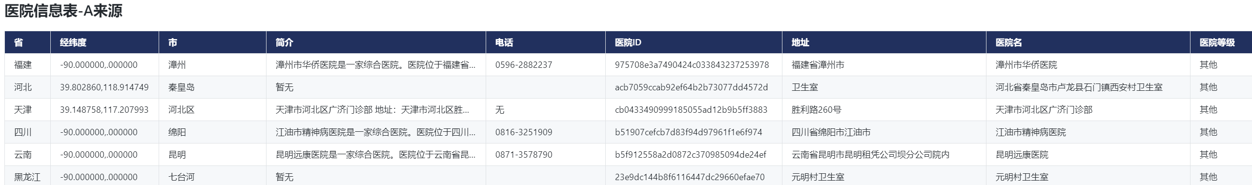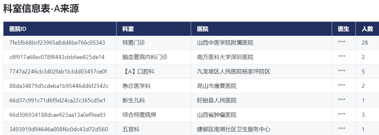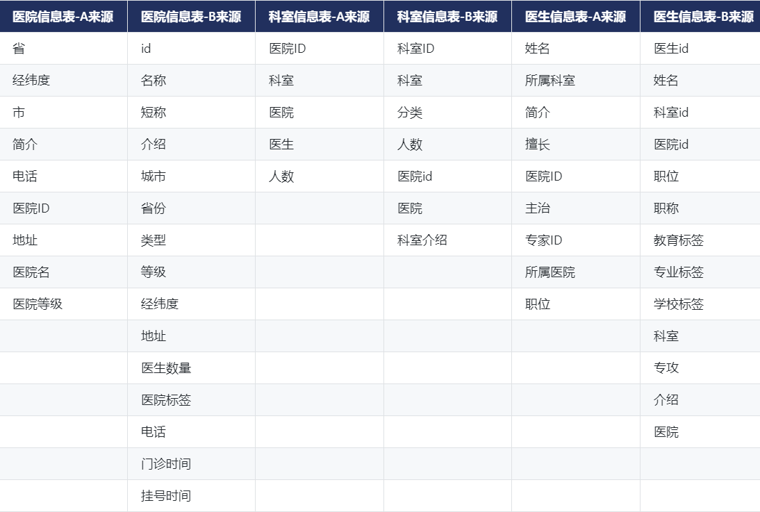 · 在字段方面,A来源与B来源的字段覆盖内容不一,B来源的字段信息宽度优于A来源,如新增了医院类型、科室简介、医生教育/专业/学校标签等字段。