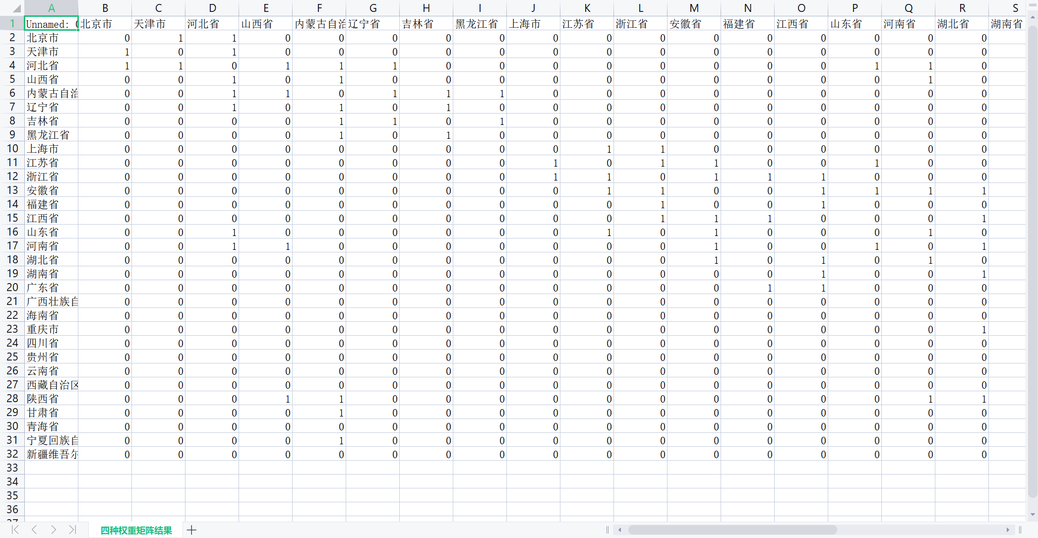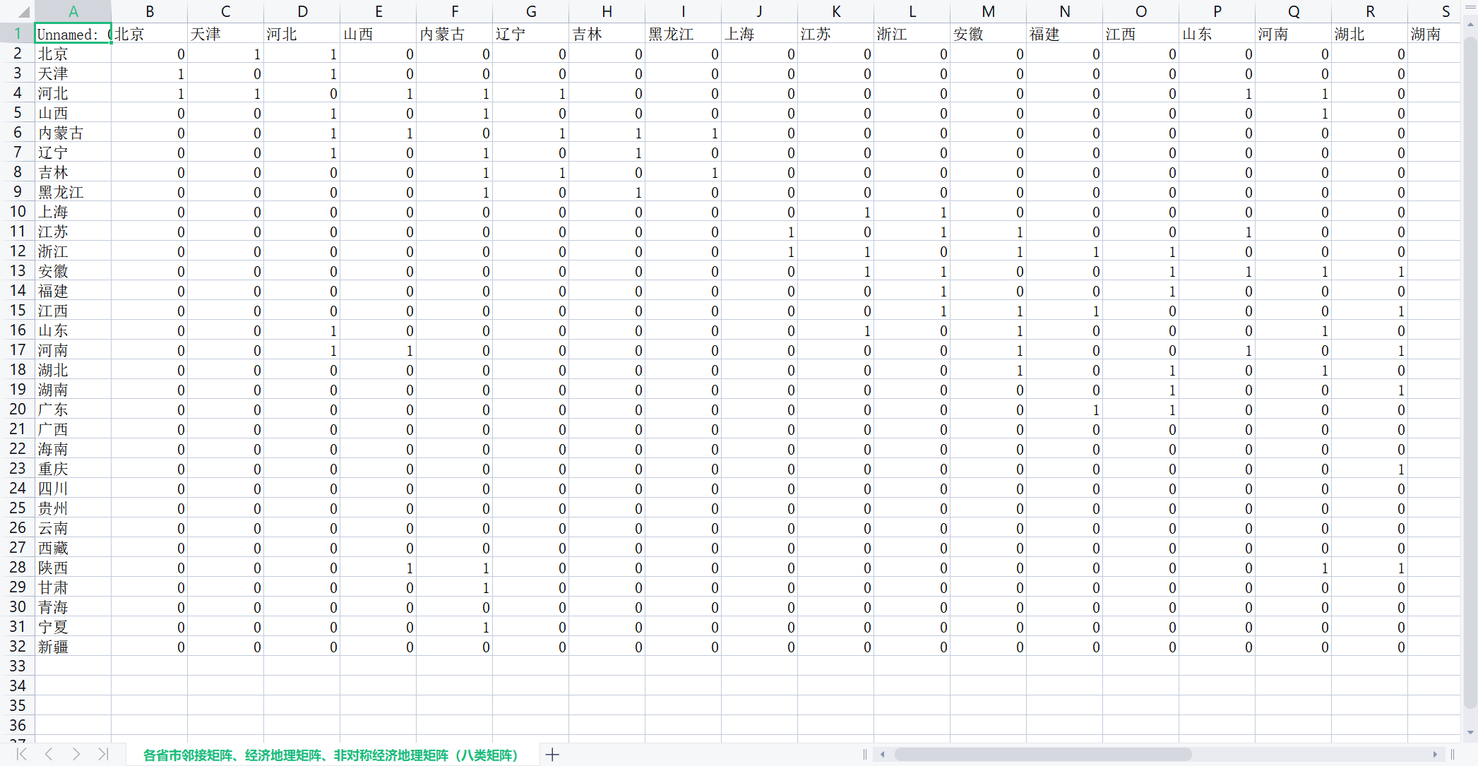 共计31个省市:全国各省市邻接矩阵、经济地理矩阵、非对称经济地理矩阵(八类矩阵)