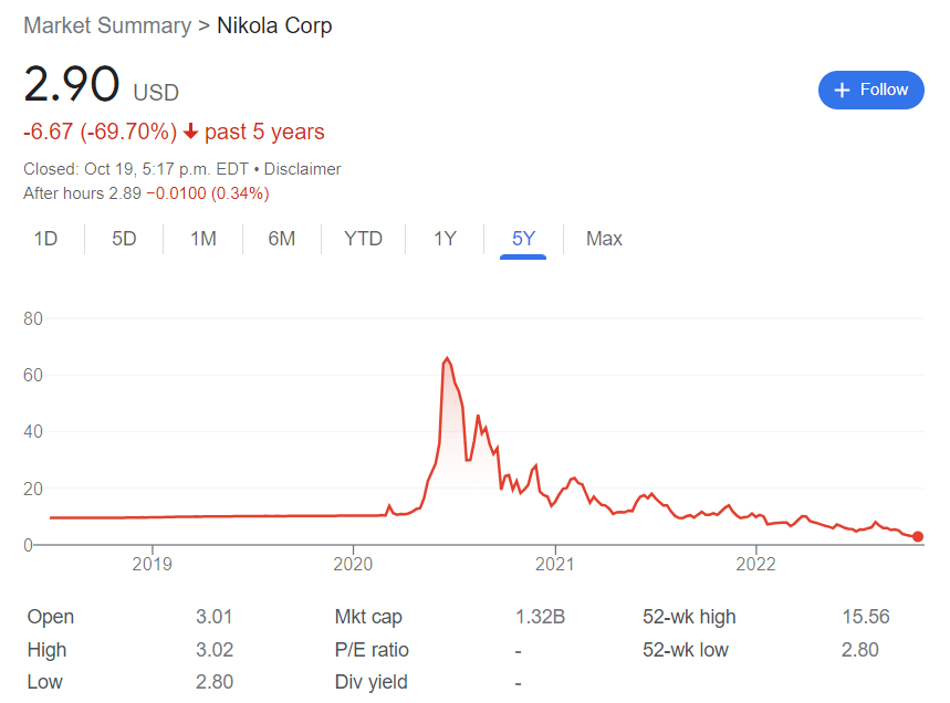 2020年6月,Nikola通过借壳上市的方式登陆纳斯达克,而且上市仅仅几天之后,Nikola市值就从上市前估值的33亿美元一路飙升了十倍多,股价盘中市值一度达到340亿美元,甚至超过了美国的老车企福特汽车。当时,米尔顿更是意气风发地表示,“我们要压垮福特F-150。”巅峰时候,还让通用汽车给他打白工。2020年9月,Nikola宣布与通用汽车达成皮卡合作协议。米尔顿表示,通用汽车将为Nikola合作生产电动皮卡。