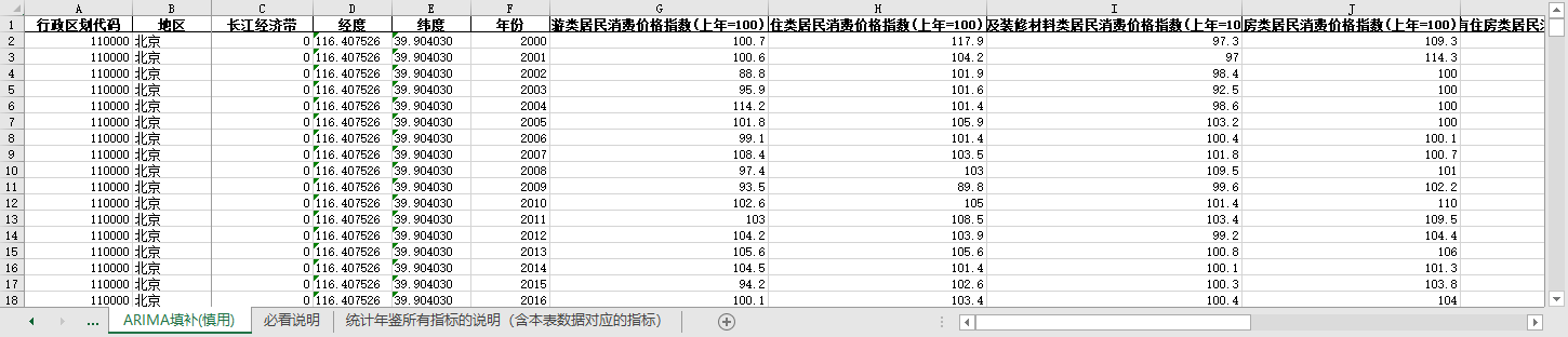行政区划代码 地区 长江经济带 经度 纬度 年份 旅游类居民消费价格指数(上年=100)() 居住类居民消费价格指数(上年=100)() 建房及装修材料类居民消费价格指数(上年=100)() 租房类居民消费价格指数(上年=100)() 自有住房类居民消费价格指数(上年=100)() 水电燃料类居民消费价格指数(上年=100)()
