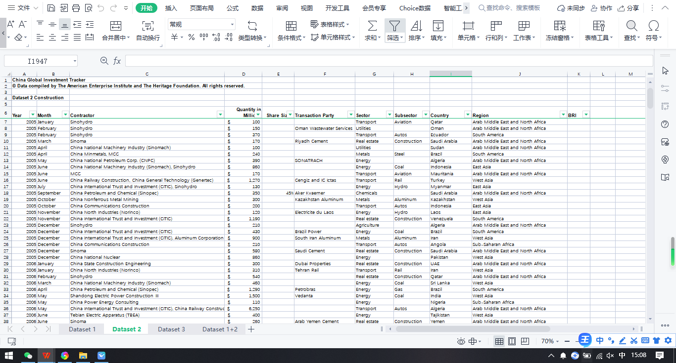 “中国全球投资跟踪”(China Global Investment Tracker)数据库。该数据库是唯一一套涵盖中国全球投资和建设的综合数据集,同时使用分别记录和汇总记录两种方法注明数据来源,截至目前记录了2005年至2022年6月间,包括能源、交通、房地产等行业的3800笔大型交易,以及约350笔问题交易。Dataset 1是所有非工程建筑类投资,Dataset 2是所有工程建筑类投资,Dataset 3是出现问题的投资,Dataset 1+2是Dataset 1和Dataset 2的合并。