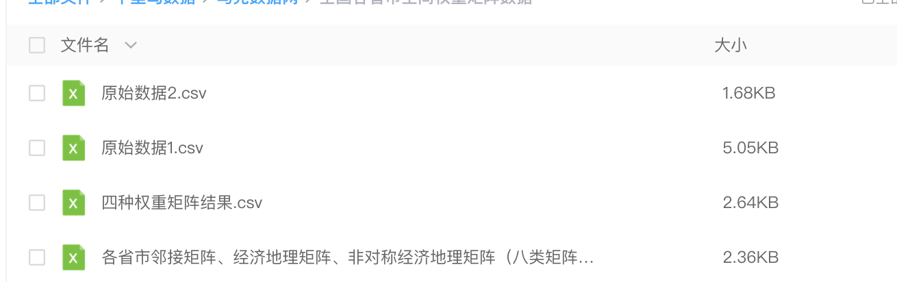 原始数据1.csv; 原始数据2.csv; 各省市邻接矩阵、经济地理矩阵、非对称经济地理矩阵(八类矩阵).csv; 四种权重矩阵结果.csv