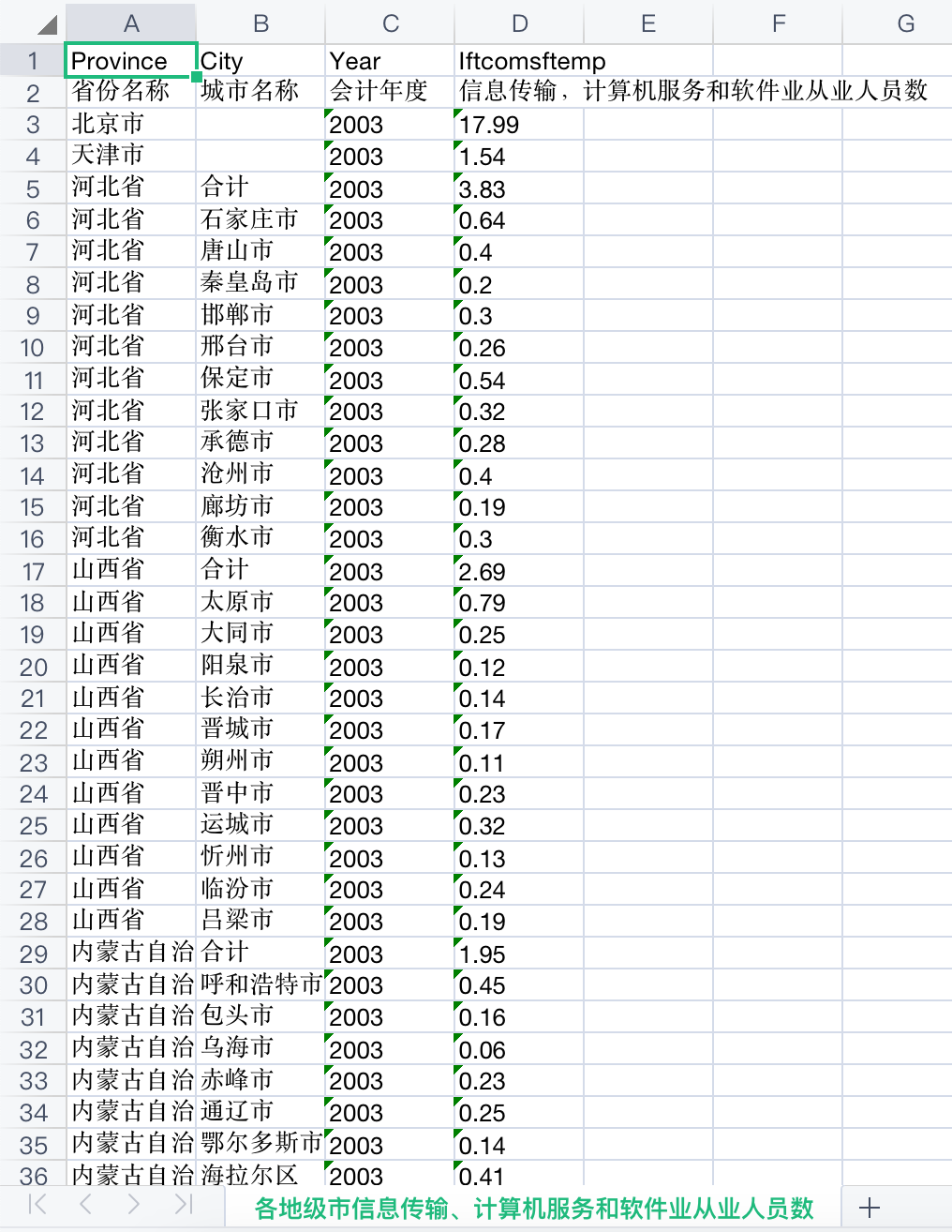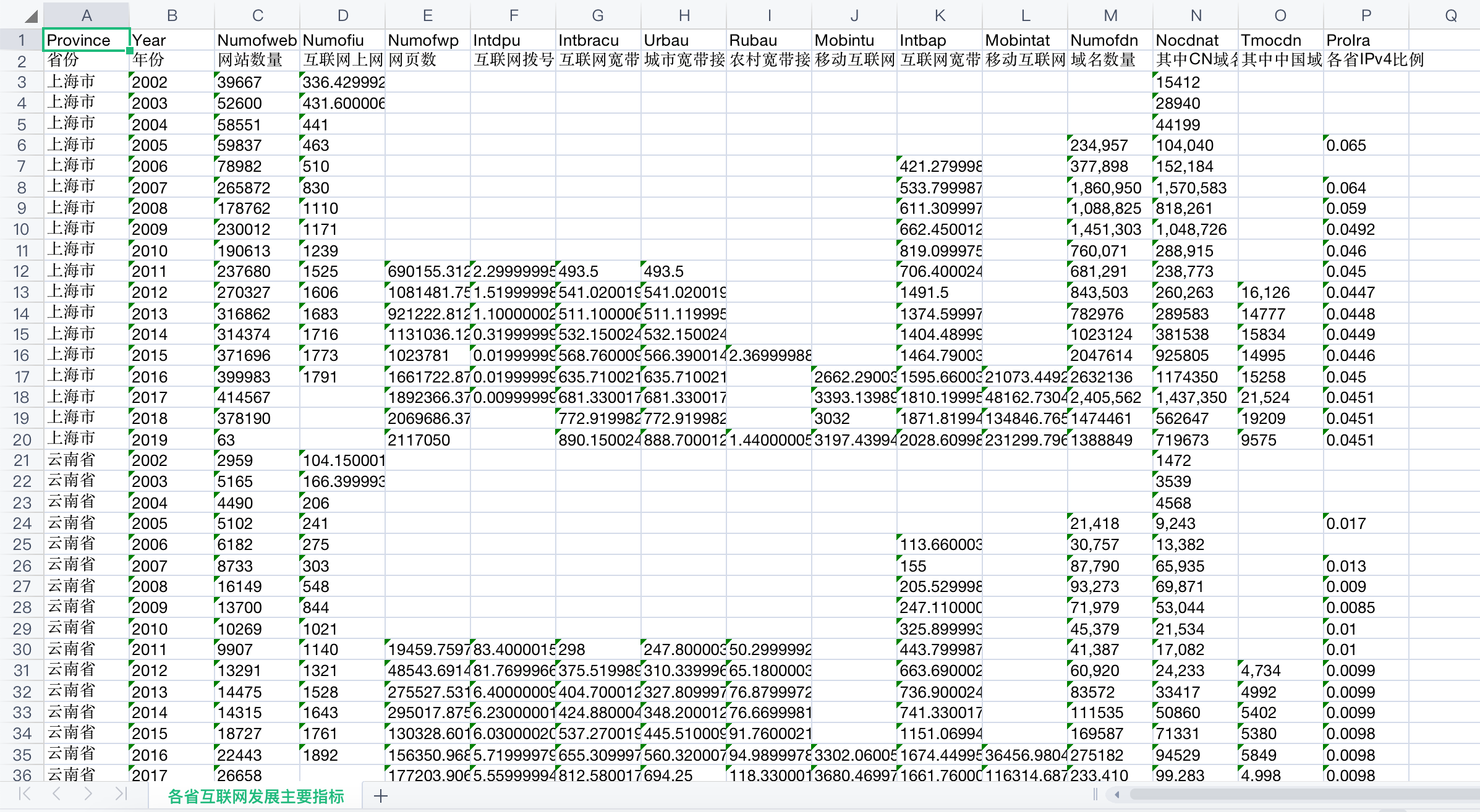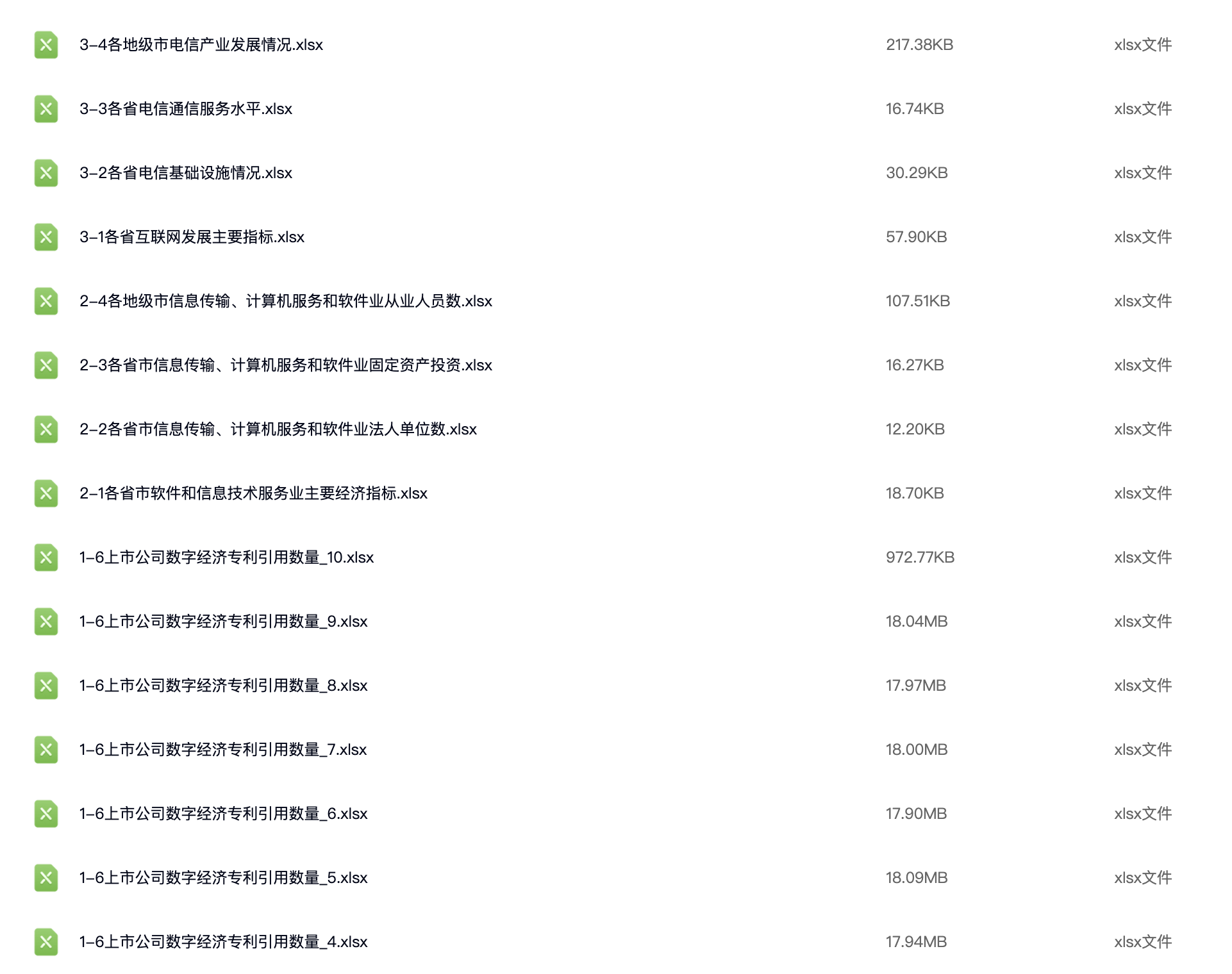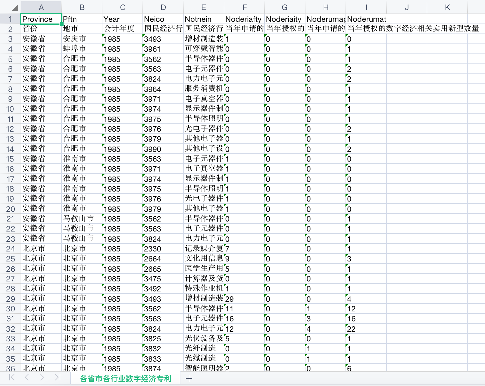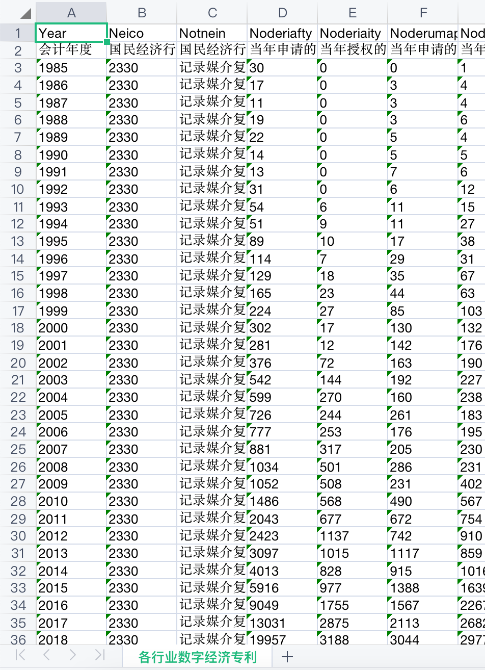 该数据从数字创新、数字产业和数字平台3个模块对我国数字经济发展情况进行展示,其中,数字创新包括各省、地级市、各行业的数字专利申请与授权情况,上市公司数字经济申请与授权情况;数字产业包括我国信息传输、计算机服务和软件行业的主要经济指标情况;数字平台则展示了各省和地级市电信及互联网等数字经济基础设施的发展情况。数据一共14份大表格,24份小表格。
