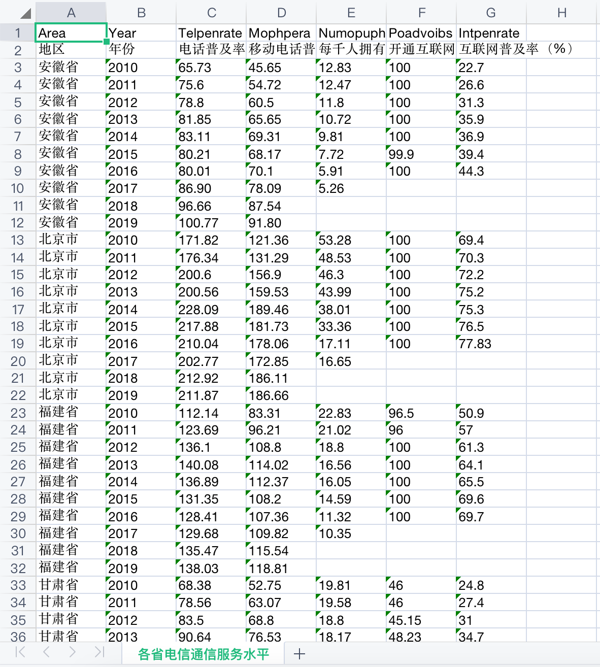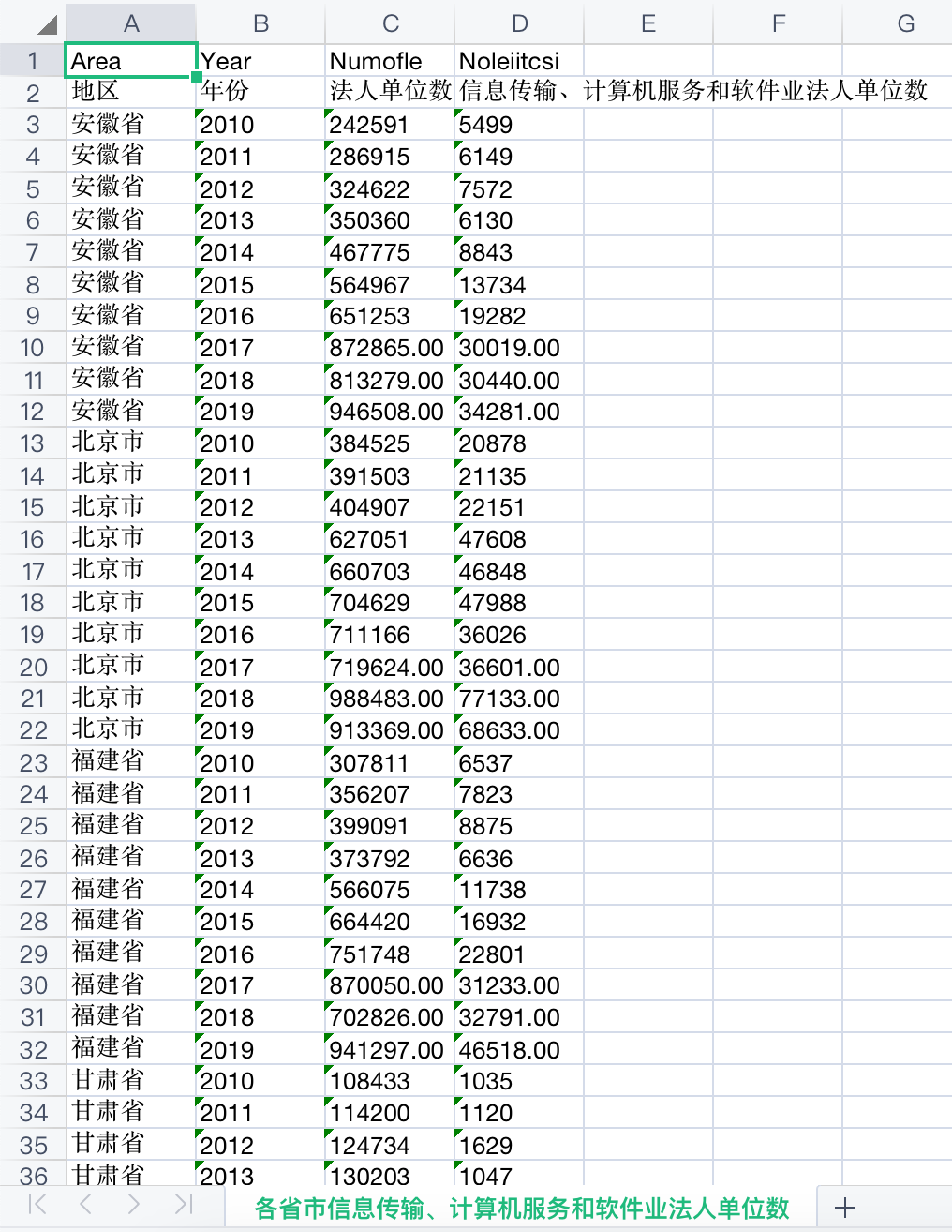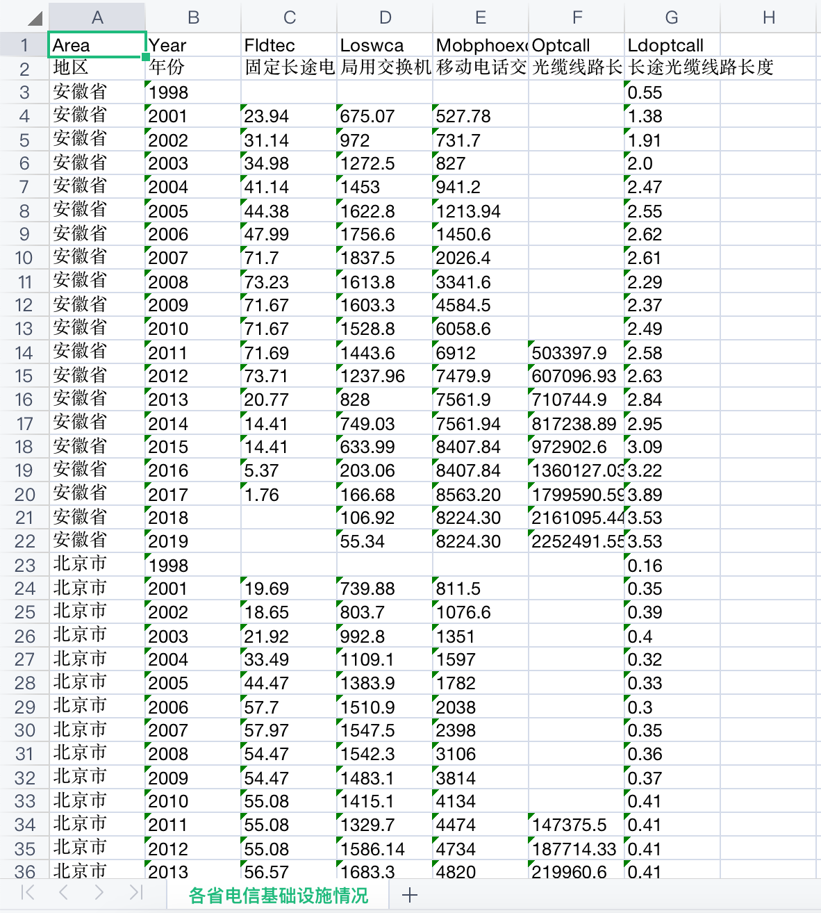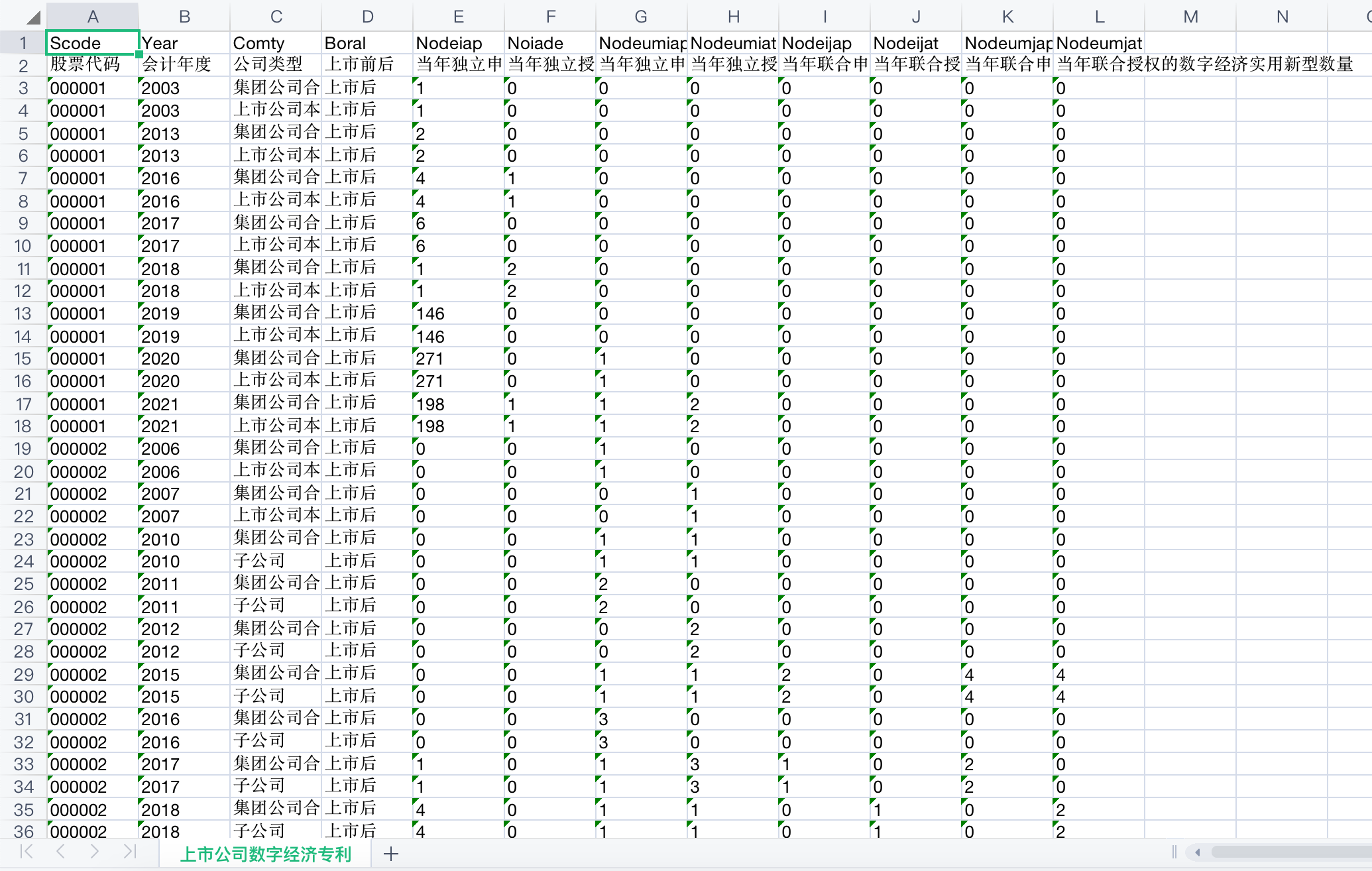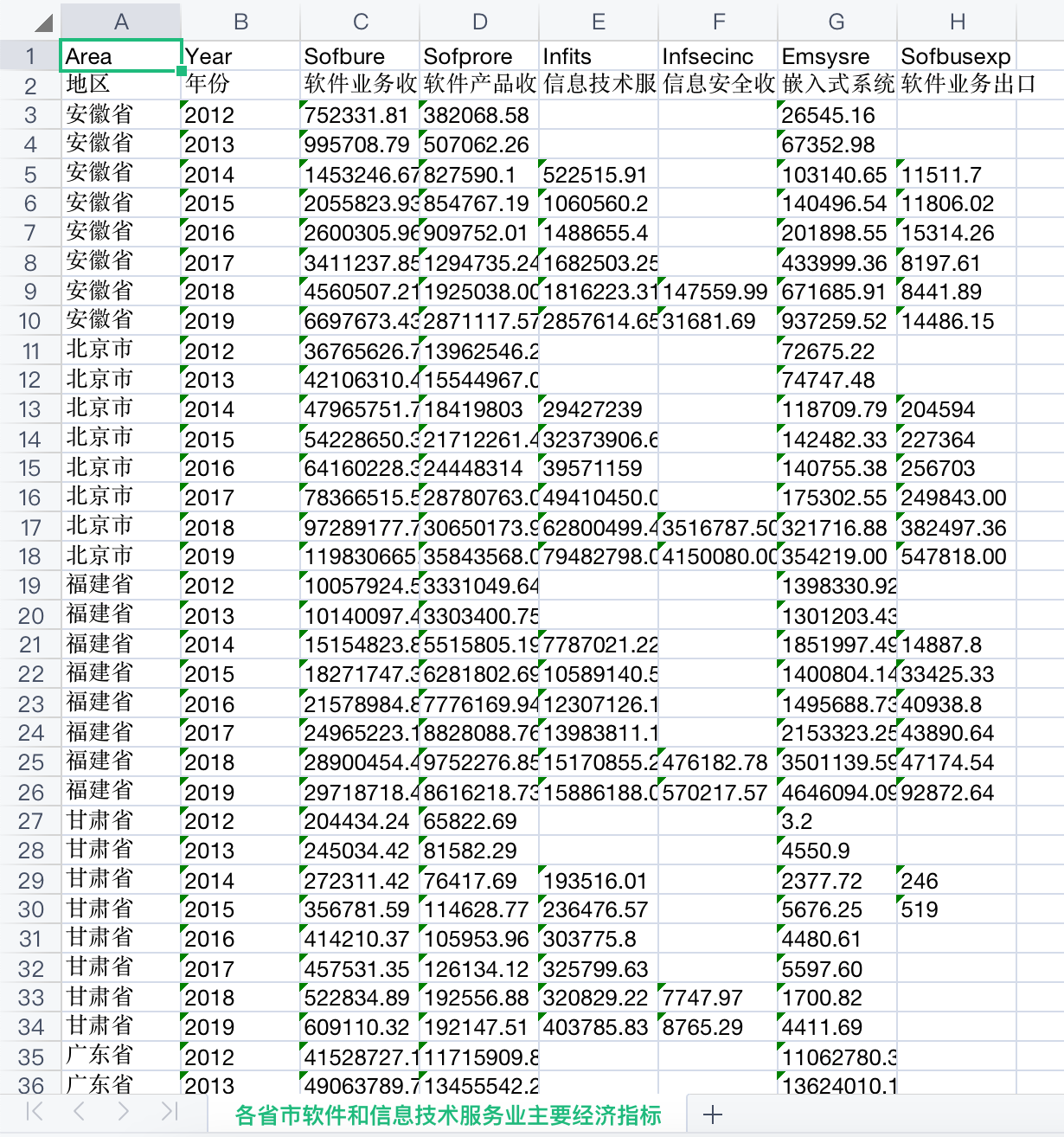 该数据从数字创新、数字产业和数字平台3个模块对我国数字经济发展情况进行展示,其中,数字创新包括各省、地级市、各行业的数字专利申请与授权情况,上市公司数字经济申请与授权情况;数字产业包括我国信息传输、计算机服务和软件行业的主要经济指标情况;数字平台则展示了各省和地级市电信及互联网等数字经济基础设施的发展情况。数据一共14份大表格,24份小表格。
