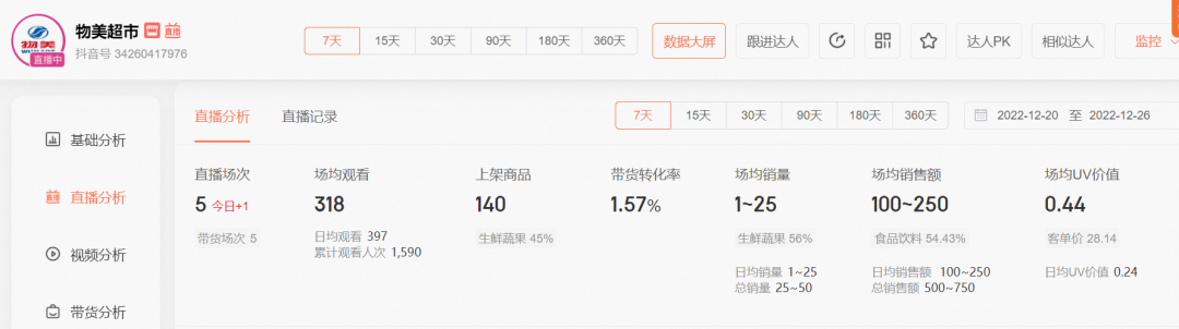 尽管总体下单体验还算丝滑,但销量并不尽如人意。截至发稿前,“物美超市”累积粉丝数2818,近7天内开播5场,蝉妈妈数据显示,场均观看318,销售额不足750元,销量最高的品类是生鲜水果,占比达到56%,余下销量以食品饮料居多。相较而言,不限于小时达,地域性没那么强、可全国发货的“物美卖场旗舰店”,近7天开播5场,销售额在2.5—5万元区间,已经算是较好的成绩。一小时送达的直播版外卖生意,并不如想象中那样容易。