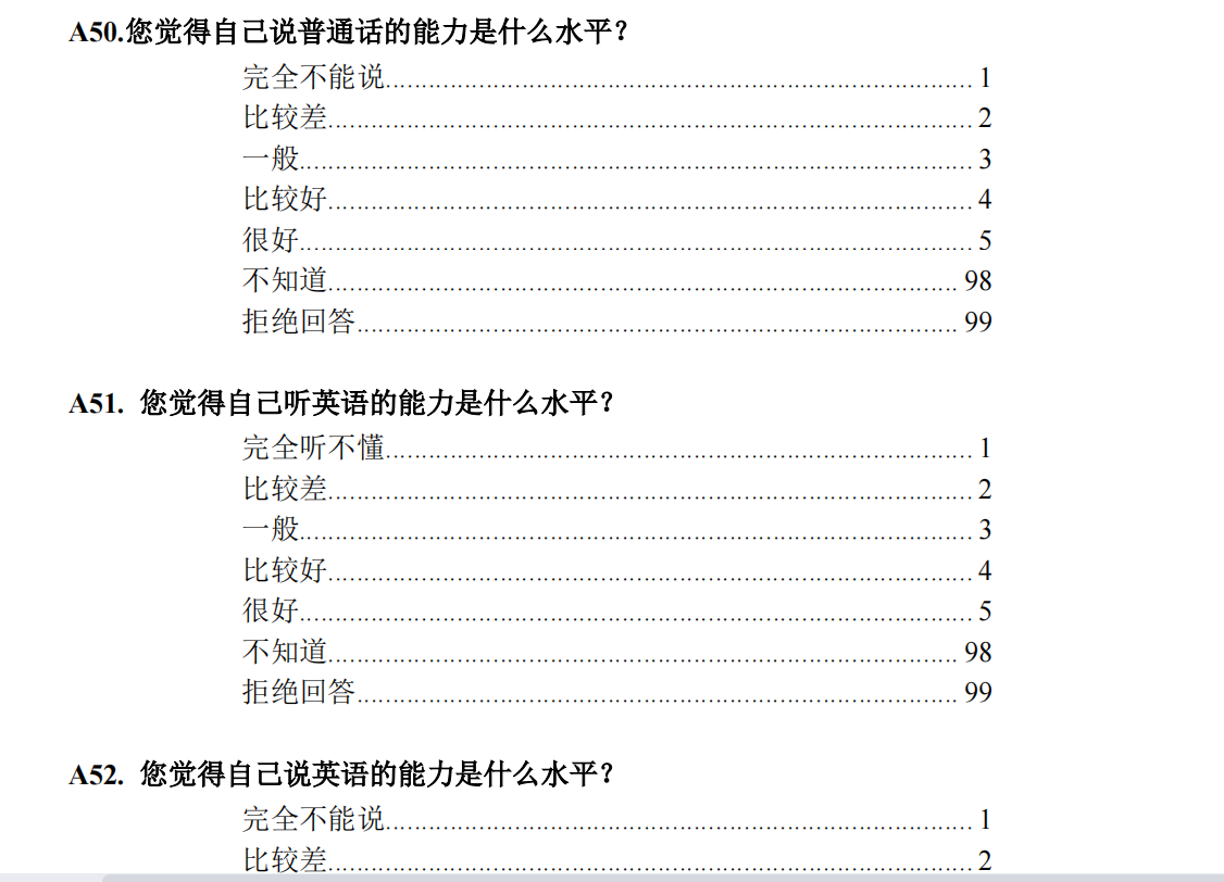 请问在CGSS数据中,问题“您觉得自己听/说英语的能力是什么水平”和“您觉得自己听/说普通话的能力是什么水平”用这个单一的维度代表个体认知能力可以吗?或者在变量选取时处理成了一个变量吗,有没有朋友看过类似文献的理论支持,感谢!