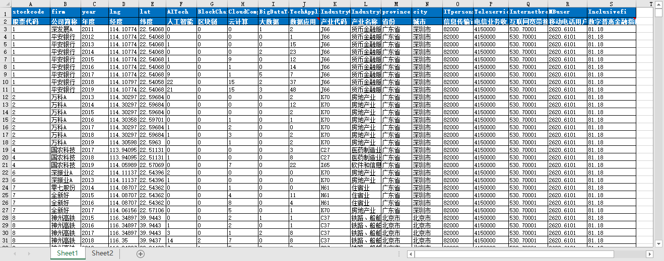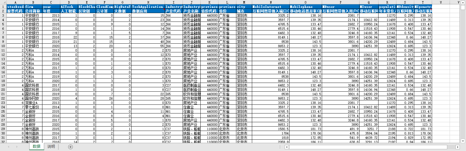 股票代码 公司简称 年度 经度 纬度 人工智能 区块链 云计算 大数据 数据应用 产业代码 产业名称 省份 城市 信息传输计算机服务和软件业人数 电信业务收入万元 互联网宽带接入用户数万户 移动电话用户数万人 数字普惠金融指数