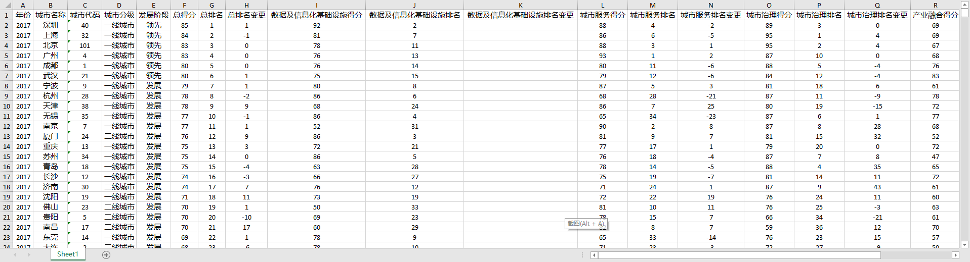 年份 城市名称 城市代码 城市分级 发展阶段 总得分 总排名 总排名变更 数据及信息化基础设施得分 数据及信息化基础设施排名 数据及信息化基础设施排名变更 城市服务得分 城市服务排名 城市服务排名变更 城市治理得分 城市治理排名 城市治理排名变更 产业融合得分 产业融合排名 产业融合排名变更