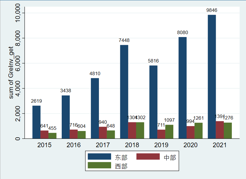 graph bar (sum) GreInv_get, over(np) over(Year) asyvars blabel(bar)