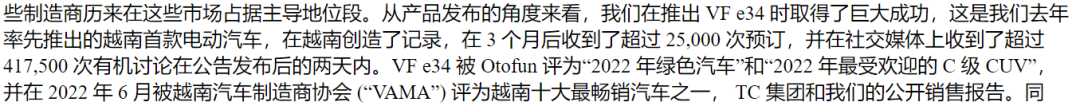 不过,范首富是有想法的,他自打造车起就知道电动化是未来,这几款燃油车也就是拿来过渡一下。所以在 Fadil 卖爆了之后,VinFast 一口气是直接推了三款电车,VF e34、VF e35、VF e36。你别说,这电动化初试的成绩还不错,招股书显示,VF e34 在 3 个月内收到了 2.5 万个订单,直接刷新了越南的纪录,还被越南汽车制造商协会 ( VAMA ) 评为十大畅销车。