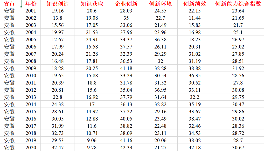 2001-2020年各省创新能力综合指数数据,样本时间新,数据量大,基本可以满足毕业论文写作和科研需求。数据真实可靠,辛苦整理所得,分享给大家,希望对论坛各位同学毕业论文以及论文发表有所帮助。分享这份数据一是为了贴补家用,二是为了共享知识,希望诚心需要的同学下载使用,使用过程中如有任何疑问,可以加q2961096086交流心得。衷心祝愿论坛各位同仁毕业和发文顺利!整理的非常完整,十分规范,排版也很漂亮,节省您大量收集与整理时间,绝对物有所值!