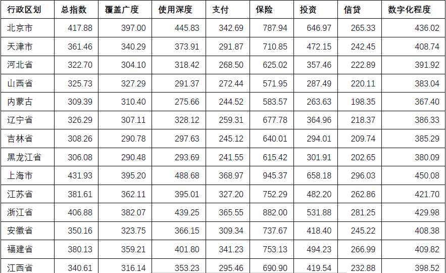 2.指数属性:这套指数包括数字普惠金融指数,以及数字金融覆盖广度、数字金融使用深度以及普惠金融数字化程度,此外使用深度指数中还包含支付、信贷、保险、信用、投资、货币基金等业务分类指数。