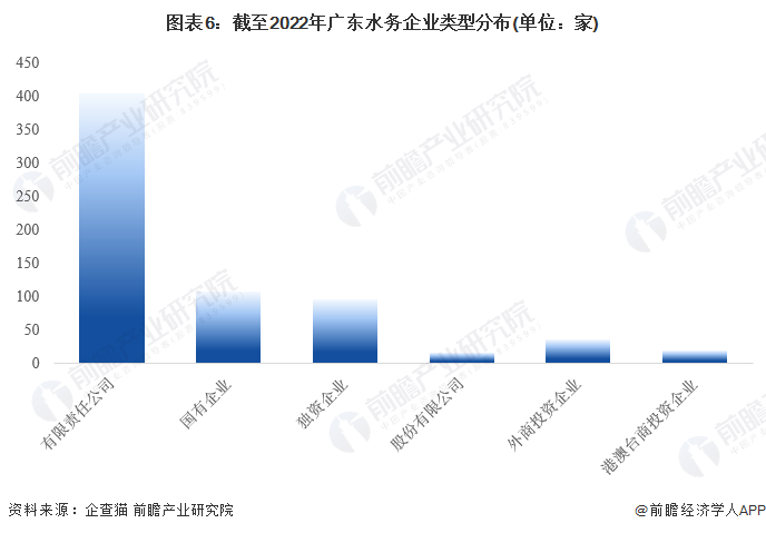 根据中国企业数据库企查猫,目前广东水务企业以有限责任公司为主,目前共有404家;其次为国有企业的107家;独资企业有96家。