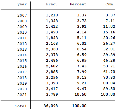 样本选择:全部A股2007-2021年数据(“扣除非经常性损益后的基本每股收益”在数据库中是从2007年开始,所以数据起点选择为2007年)