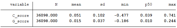 对模型(4)分年度进行横截面回归,得出系数λ0~λ3,再带入模型(3)即可得到会计稳健性指标C_score,C_score值越大,会计稳健性程度越高。