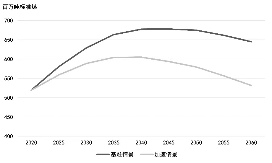 图2 2060年前京津冀地区能源相关二氧化碳排放总量(二)京、津能源消费总量率先于2035年前后达峰,河北能源消费总量持续增长,将于2045年前后达峰北京能源消费总量短期内仍呈上升趋势,预计2033年前达峰,随后持续下降。2025年后北京市基本实现供热无煤化,天然气成为主要的化石能源,非化石能源消费逐渐增多,实现一次能源清洁化供应。天津能源消费总量呈缓慢增长趋势,2040年前将经历较长的峰值平台期。加速情景下,随着行业电气化水平的提升,2060年一次电力及其他能源占比将达到83.6%。河北能源消费总量持续增长,基准和加速情景下分别于2048年和2042年前后达峰,峰值分别约5.4亿吨和4.7亿吨标准煤。基准情景下,短期内煤炭消费量稳中有升,之后逐步下降,油品和天然气消费量先升后降。加速情景下,煤炭消费量持续下降,油品和天然气消费量先升后降,峰值低于基准情景。