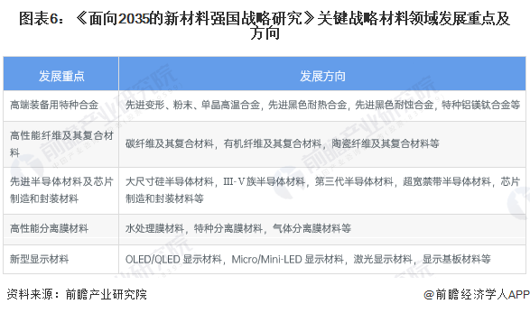 2021年9月10日,中国工程院发布《面向2035的新材料强国战略研究》,该战略指出:关键战略材料领域发展重点及发展方向主要包括高端装备用特种合金、高性能纤维及其复合材料、新型能源材料、先进半导体材料及芯片制造和封装材料、稀土功能材料、电子陶瓷和人工晶体、先进结构功能一体化陶瓷和功能梯度材料、高性能分离膜材料、新型显示材料、新一代生物医用材料及生物基材料等。