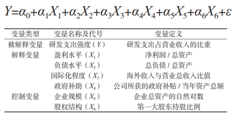 针对创新影响因素的分析,作者构建了多元线性回归模型,考虑的影响因素如表所示,主要涉及企业的盈利水平、负债水平、国际化程度、政府补助等。