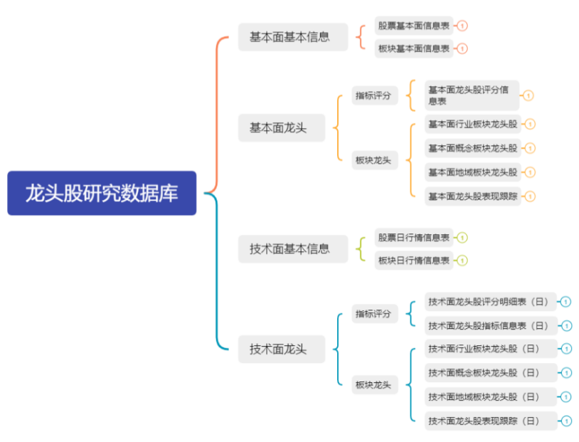 CSMAR龙头股研究数据库分为基本面基本信息、基本面龙头股、技术面基本信息和技术面龙头四部分。基本面基本信息收录股票基本信息表和板块基本信息表;技术面基本信息收录股票日行情信息表和板块日行情信息表。基本面龙头股和技术面龙头都由两部分组成,分别是个股指标计算明细和板块龙头表现追踪明细。后者分为行业、概念和地域板块三部分,以及表现追踪表。