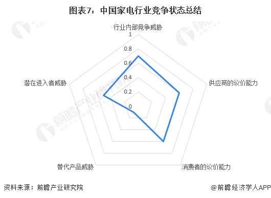 根据以上分析,对各方面的竞争情况进行量化,1代表最大,0代表最小,目前我国家电行业五力竞争总结如下: